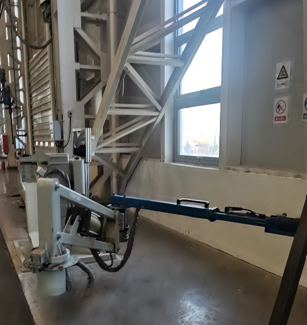 The power-assisted mechanical arm is designed with ergonomics and equipped with multiple safety protections to avoid the hazards of manual handling of heavy components.